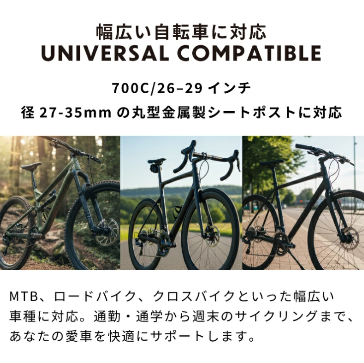 幅広い車種に対応する安定構造! 700C/26~29インチのシートポスト径27-35mmの丸型金属製シートポストに対応しており、クロスバイク、グラベルバイク、MTBなど幅広い車種に装着可能です。