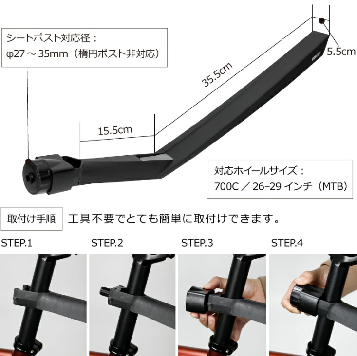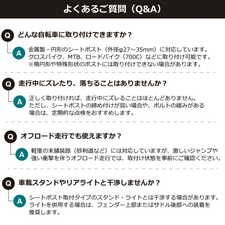・楕円形シートポストには取り付けできない場合があります。 ・タイヤとの干渉がないことを必ず確認してください。 ・ボルトは確実に締め付け、定期的に緩みがないか点検してください。 ・両面テープは再利用できません。粘着残りが気になる場合は使用を控えてください。 ・激しいオフロード走行前には必ず点検を行ってください。
