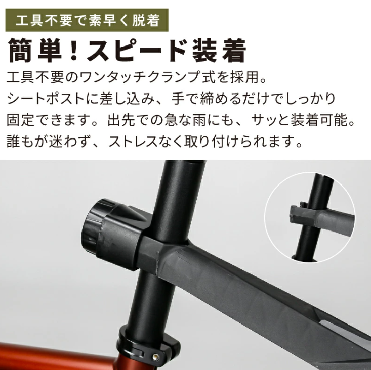 シートポストにしっかり固定できます。 この構造により、出先での急な雨天でもサッと装着でき、