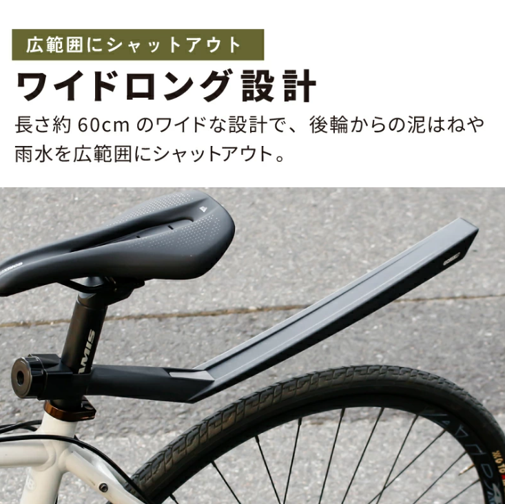 背中・リュックへの泥はねを広範囲にガード! フェンダーの長さが約60cmのワイド形状に設計されており、後輪からの泥はねや雨水を効果的に遮断します。