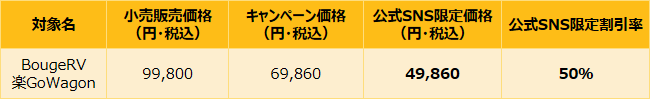 キャンペーン期間中、BougeRV公式LINEにて、BougeRV公式サイトでご利用いただける「楽GoWagon」半額クーポンコードを配布いたします。登録済みの方も新規登録の方も、どなたでもご利用いただけます!コードを会計画面で適用すると、直ちに49,860円(税込)の特別価格になります!