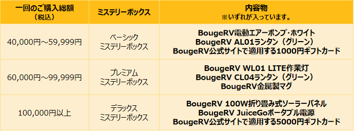 ・購入金額が40,000円(税込)以上60,000円(税込)未満の場合、ベーシックミステリーボックスを1個プレゼントいたします。BougeRV電動エアーポンプ(ホワイト)・BougeRV AL01ランタン(グリーン)・BougeRV公式サイトで適用する1000円ギフトカードのいずれかが入っています。