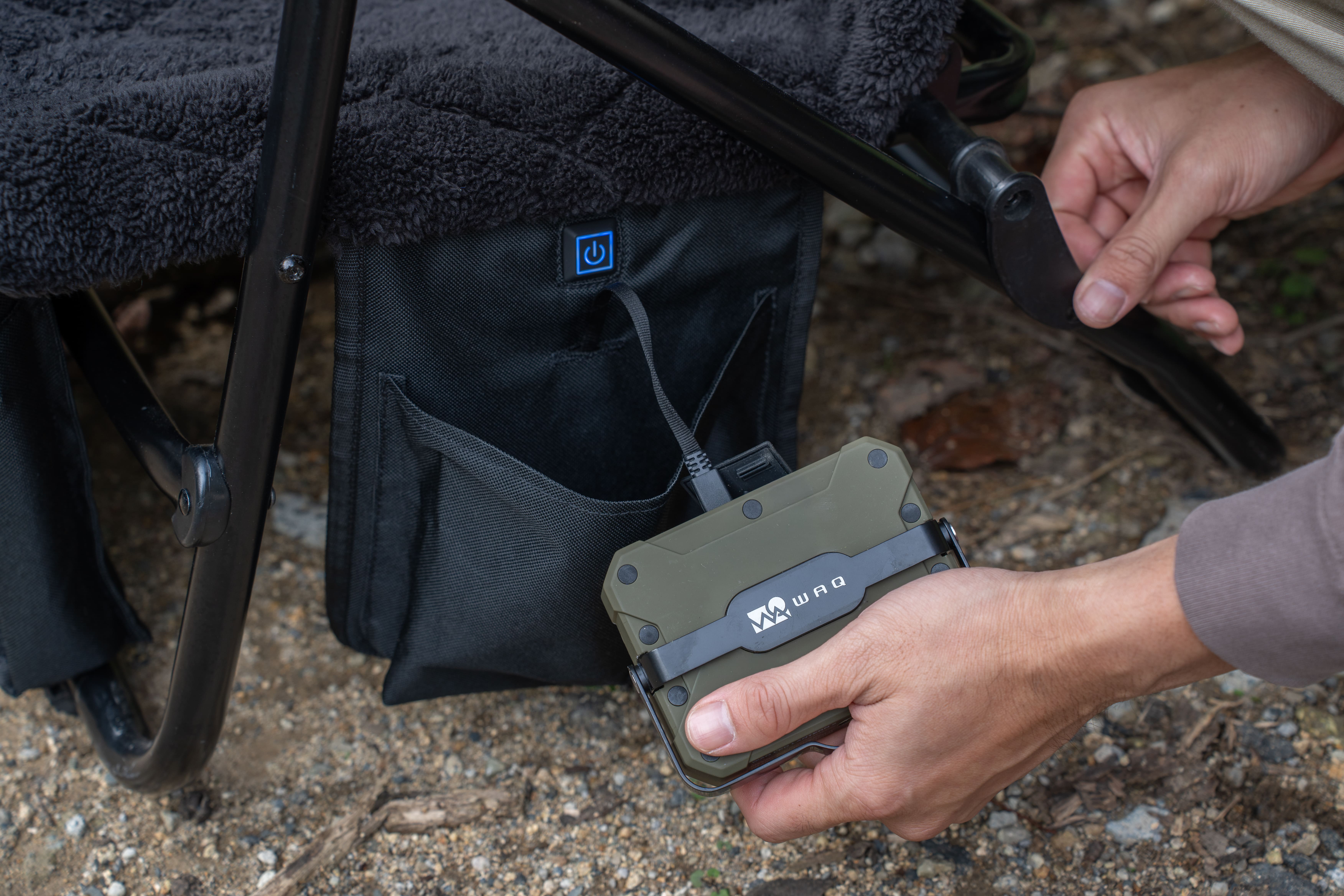 本製品は、WAQリクライニングローチェアにフィットする専用設計の電熱ヒートカバーで、3段階の温度調整(強・中・弱)とUSB給電方式を採用。使用するモバイルバッテリーを接続するだけで、チェア全体を心地よく温めることができます。表地には肌触りの良いボア素材、裏地にはマットタフタを採用し、熱を効率よく保持。寒冷時のキャンプ、夜間の焚き火シーン、早朝の作業など、幅広いシーンで活躍する製品です。