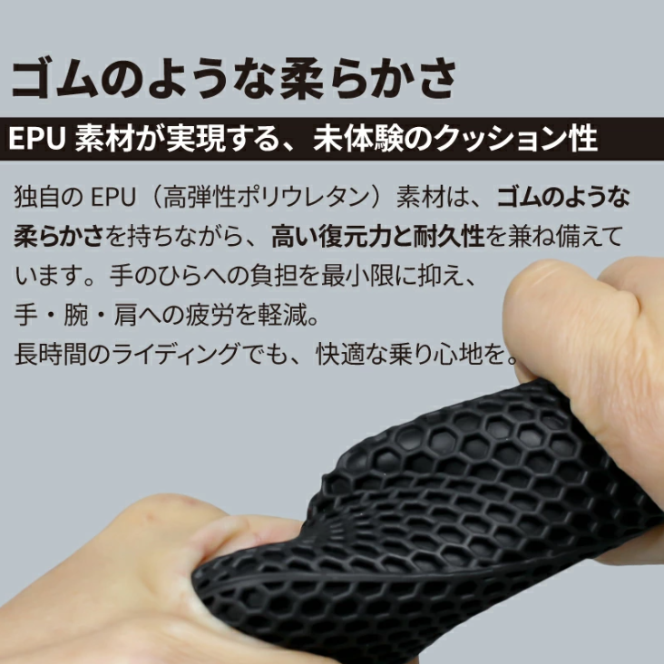 ゴムのようなソフトな握り心地と高い復元力を持ち、路面からの微細な振動や衝撃をしっかりと