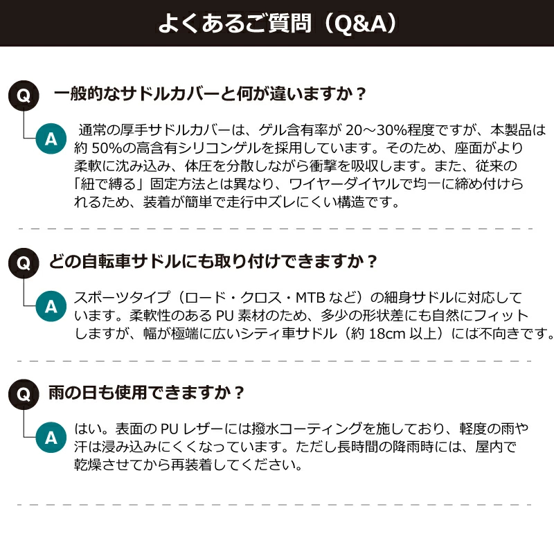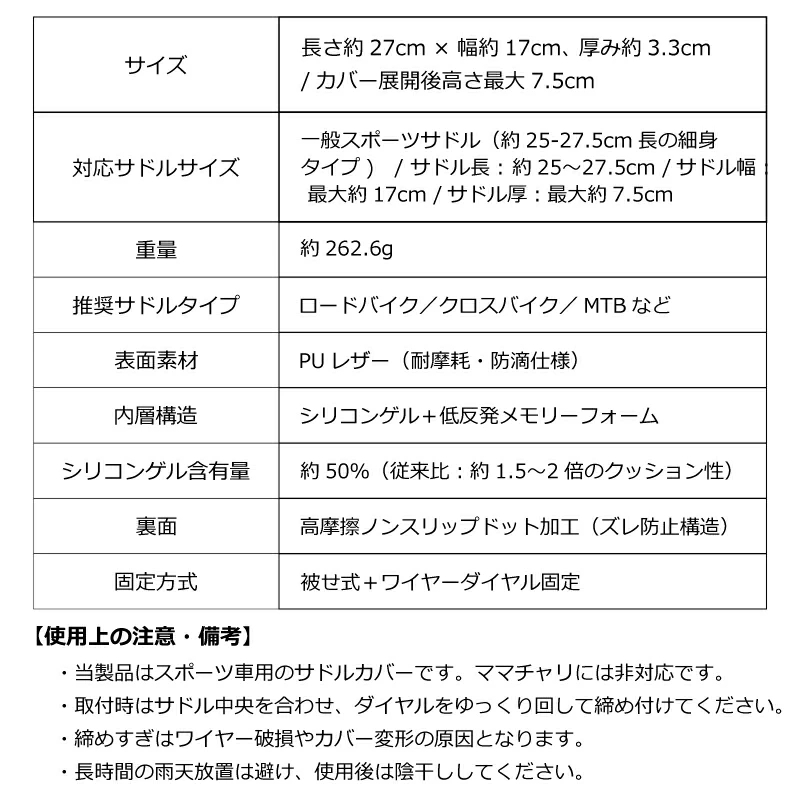 ・当製品はスポーツ車用のサドルカバーです。ママチャリには非対応です。 ・取付時はサドル中央を合わせ、ダイヤルをゆっくり回して締め付けてください。 ・締めすぎはワイヤー破損やカバー変形の原因となります。 ・長時間の雨天放置は避け、使用後は陰干ししてください。 ・洗濯機・乾燥機の使用は不可(表面PUレザーの劣化防止のため)。 ・火気・高温環境での保管は避けてください。