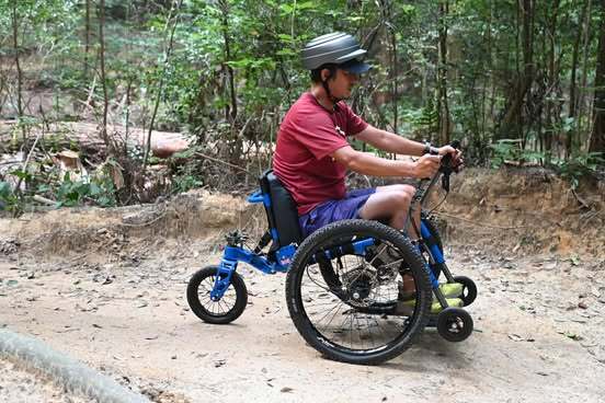 英国で開発された、全地形対応型のアウトドア用車いすです。最大の特徴は、泥やぬかるみで手が汚れないよう、手元のレバーを漕いで進む独自の駆動システム と、3輪それぞれに搭載された独立型サスペンションです。これにより、森の中のトレイルや砂利道といった「でこぼこの道」でも、安定した滑らかな乗り心地を実現します。