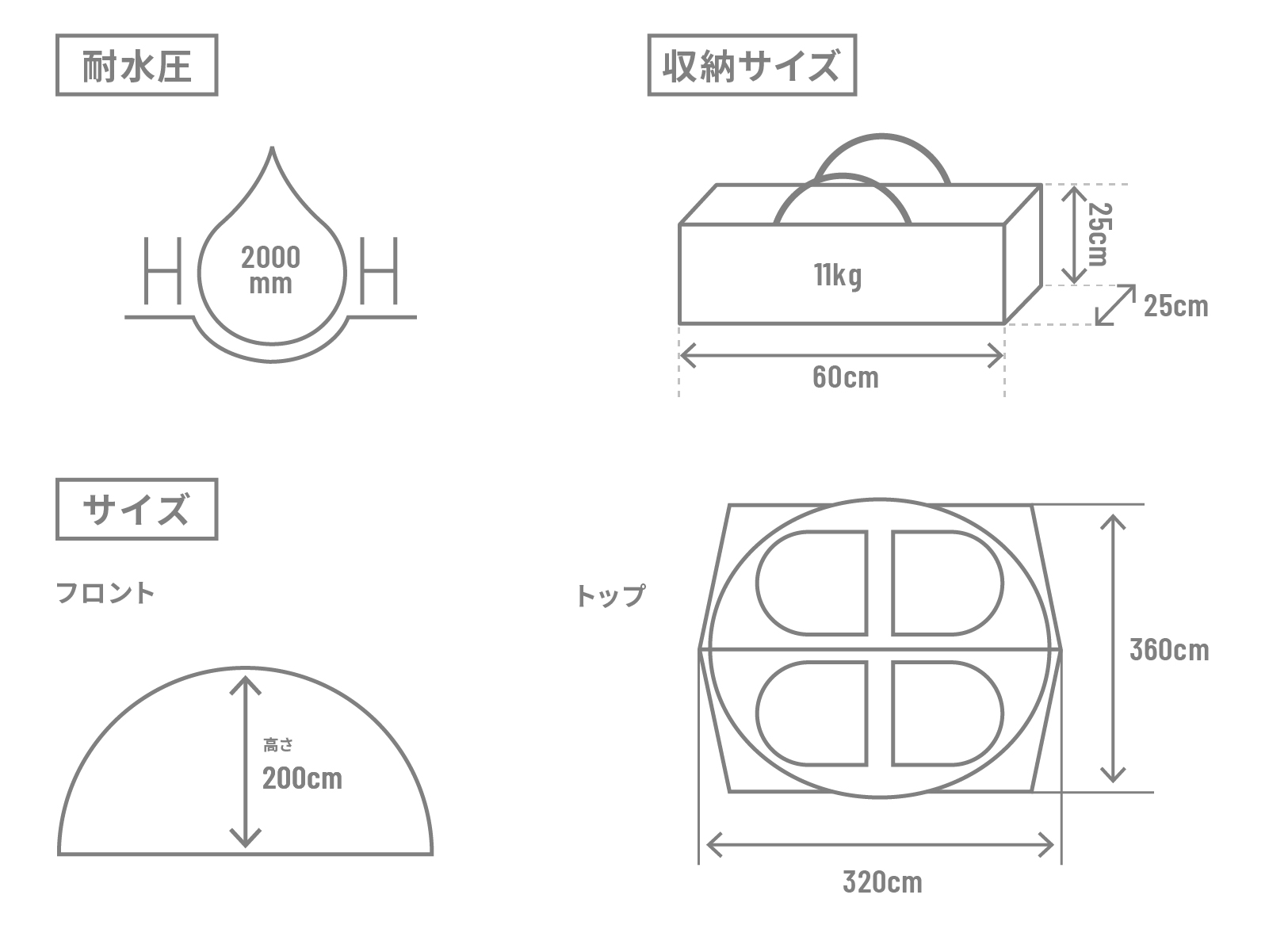 製品名:ガシーンドーム 型番・カラー:T4-209-BR・ブラウン 販売価格:88,000円(税、送料込) 組立サイズ:W320×D360×H205cm(外寸) 収納サイズ:W60×D25×H25cm 総重量:11kg 収容可能人数:大人4名 材質: <テント生地、フライシート>75Dポリエステルリップストップ(PUコーティング) <煙突用生地>ポリエステル、グラスファイバー、シリコン <煙突口金具>ステンレス鋼 <ポール>アルミ合金 <ペグ>スチール <キャリーバッグ>150Dポリエステル(PUコーティング) 最低耐水圧:2000mm UVカット:UPF 50+ セット内容:テント生地、ポール×2本、Y型ポール、V型ポール、ペグx15本、ロープ(長)x3本、ロープ(短)x4本、煙突用生地、フライシート、ポール用収納袋、ペグ・ロープ用収納袋、キャリーバッグ、タイベルト×2本 |