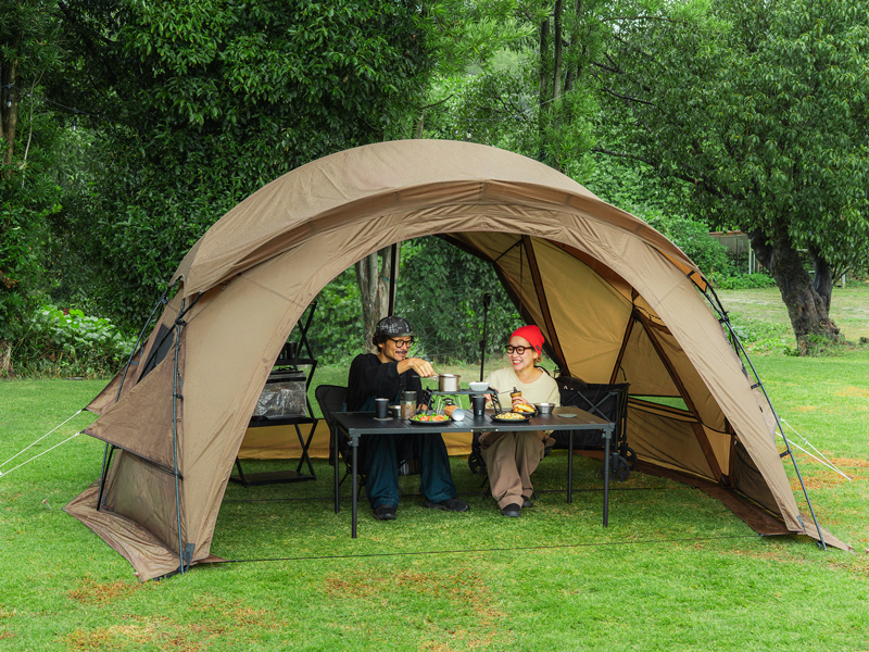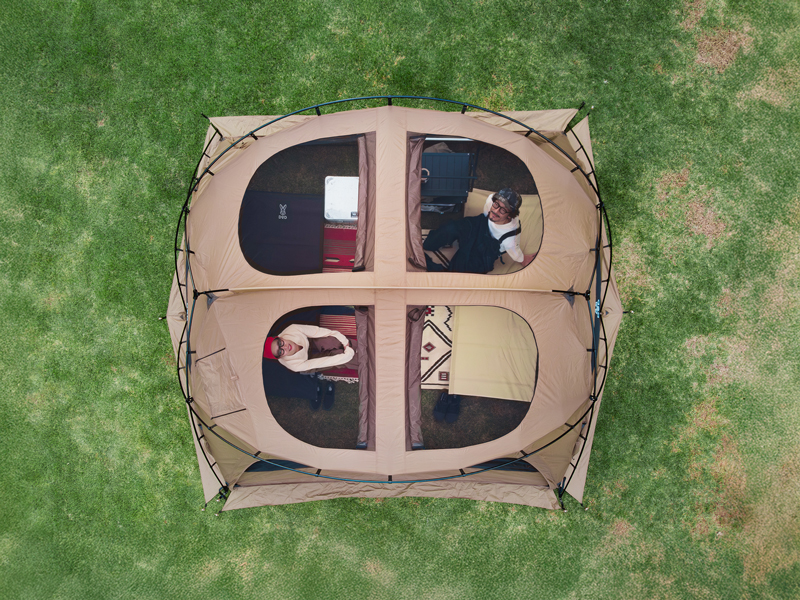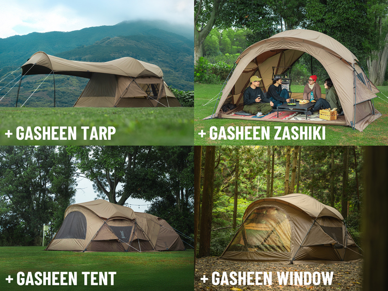 さらに専用オプション(テント、オープンタープ、フロアシート、TPU透明窓)を連結することで、2ルーム化やお座敷化など多様なキャンプスタイルにアレンジできます。