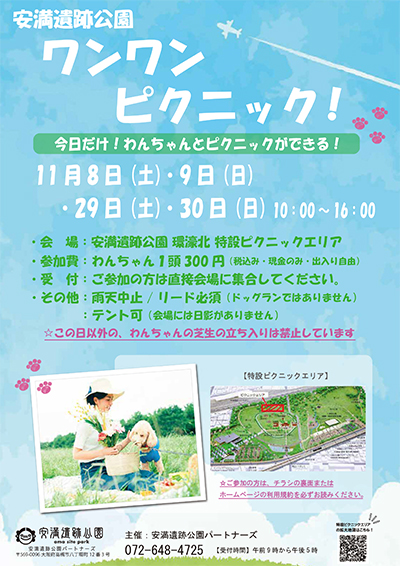 令和7年11月29日(土曜日)と 30日(日曜日)、駅から徒歩10分の中心市街地に位置する街ナカ公園・安満遺跡公園の緑広がる芝生エリアを愛犬とのピクニックのために特別に開放する「ワンワンピクニック!」が開催。心地よい秋空の下でのピクニックが楽しめる限定の2日間に、ぜひご来園ください。