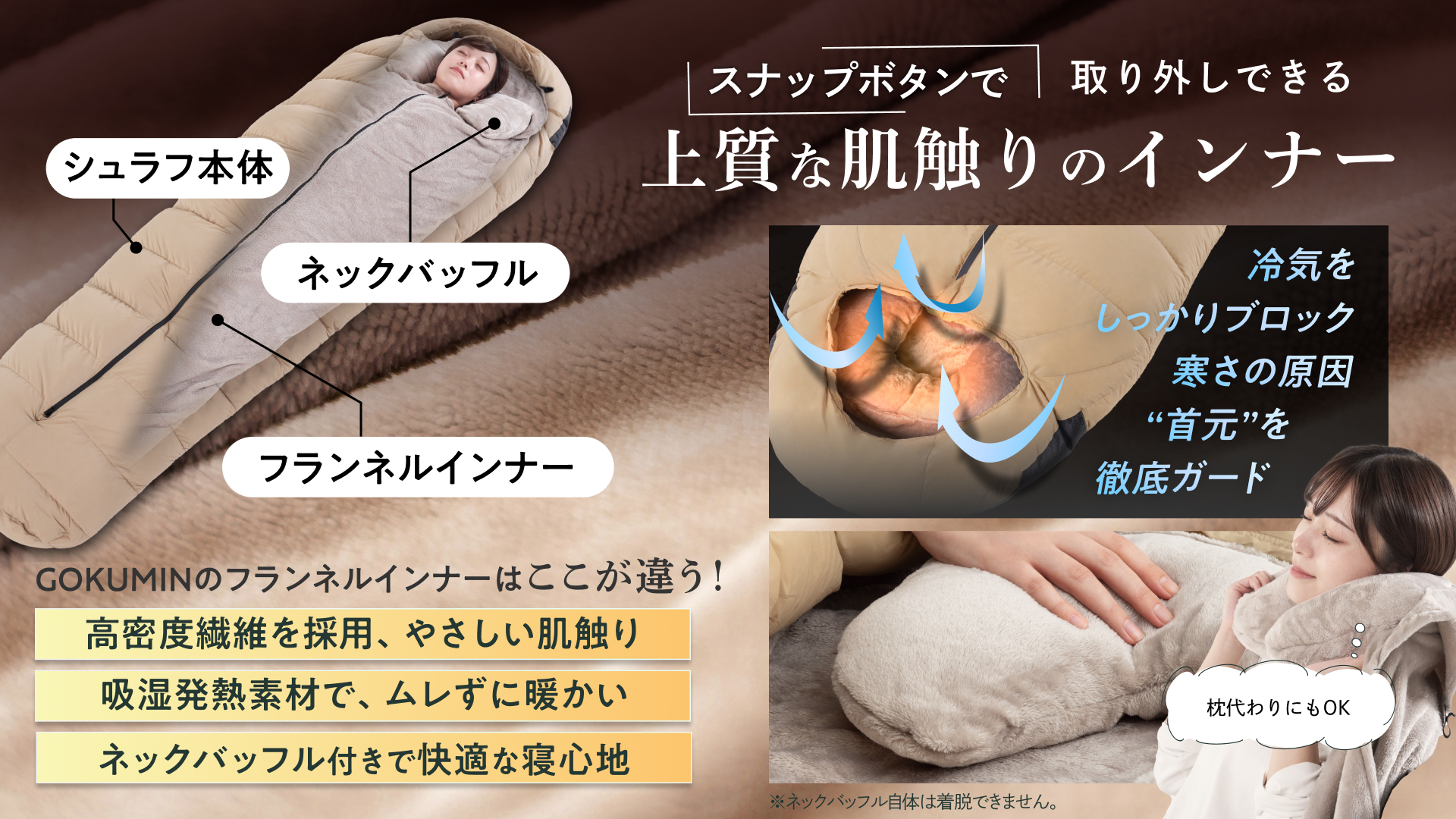 キャンプや車中泊の人気が高まる中、「寒くて眠れない」「朝に体が痛い」といったアウトドアでの睡眠に関する悩みが多く寄せられるようになりました。GOKUMINは、家庭用寝具の開発で培った“快眠ノウハウ”を活かし、屋外でも自宅と同じ寝心地を提供することを目指して本製品を企画。暖かさ、使いやすさ、持ち運びやすさにこだわり、自然の中でもストレスなく快適に眠れるシュラフとして開発しました。